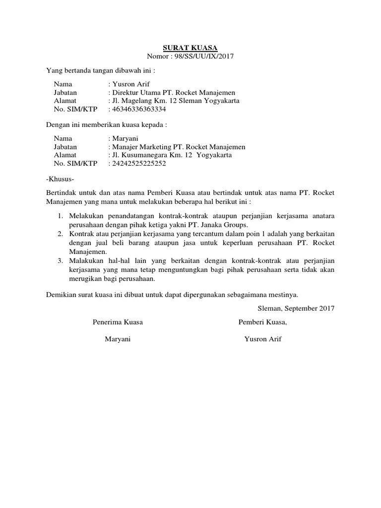Biasanya surat ini memberikan kuasa pada penerima untuk bertindak mewakili kepentingan sebagai pihak .